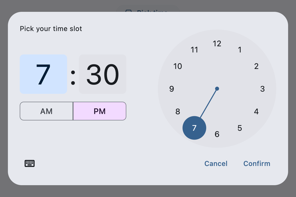 time_picker = ft.TimePicker(